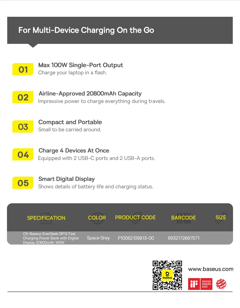 Baseus EnerGeek GR12 145W 20800mAh Power Bank