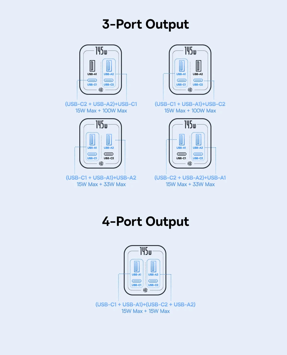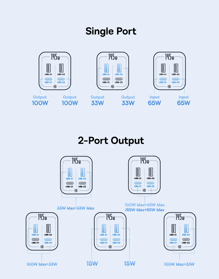 the maximum output can reach 145W the maximum out of either single port is 100W.